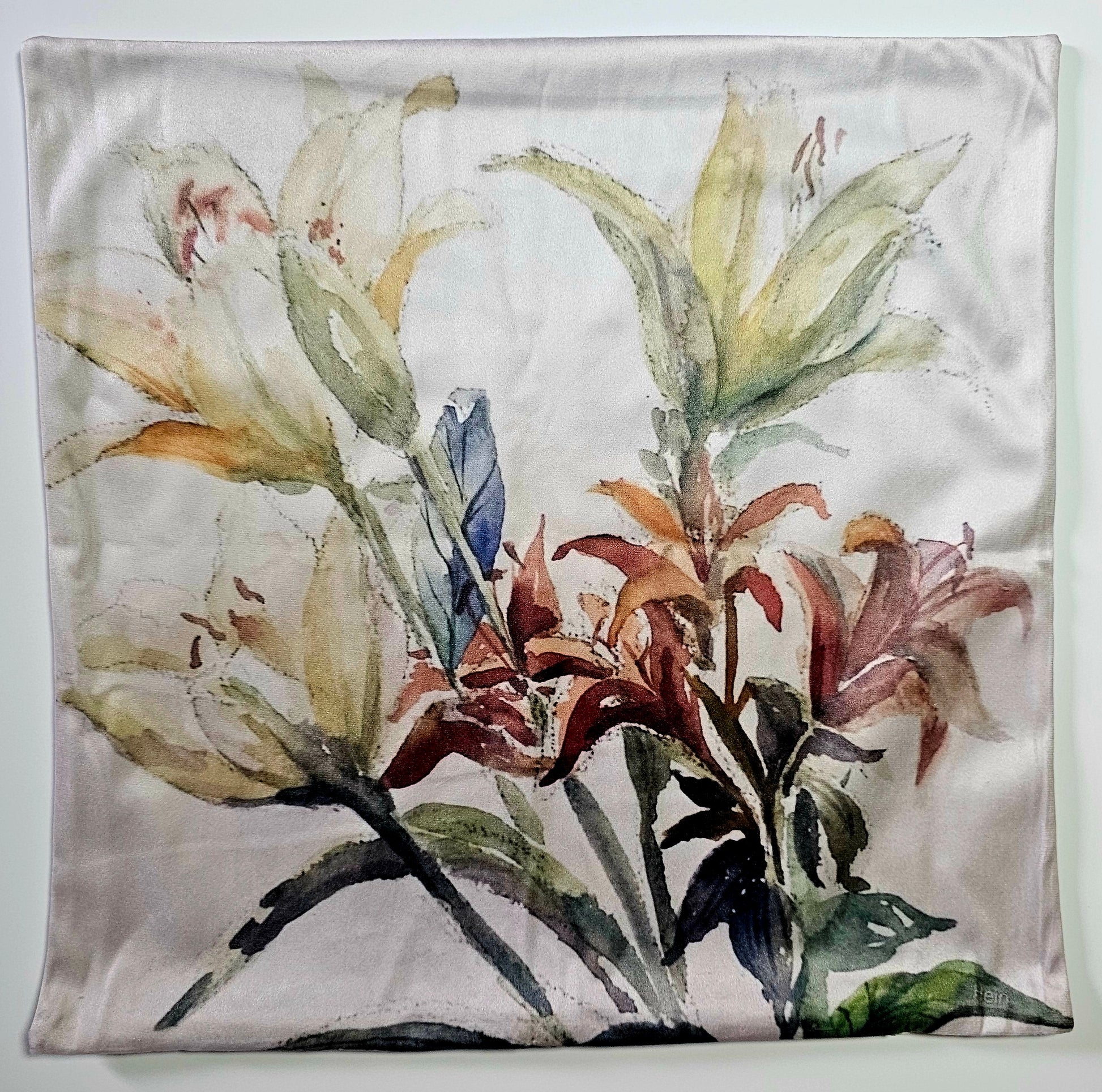 Tiger Lilies Pillow Cover Art Print. 18"x18" washable indoor/outdoor soft fabric removeable pillow cover. Zipper close. Double sided Design Multicolored Tiger Lilies watercolor image